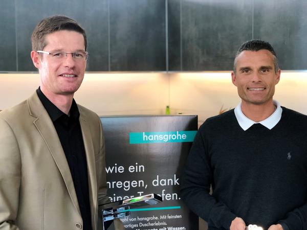 Herr Holger Kreuzer Außendienst der Firma Hans Grohe und Herr Steffen Rambacher Inhaber Küche & Bad präsentieren diese Neuheit. Beide Partner schätzen die gegenseitige Verlässlichkeit in der über jahrzente andauernden Zusammenarbeit.